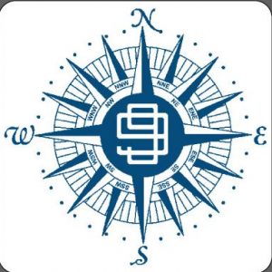 3 ½” X 3 ½” Adhesive Stickers, white background, blue compass rose, gloss laminated, rounded corners.